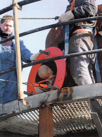 Zur Durchführung von Arbeiten an stehenden Behältern, müssen Mitarbeiter und Material über sogenannte Mannlöcher in den Behälter einfahren. Dabei kann es zu Notsituationen kommen, bei denen Mitarbeiter gerettet werden müssen. Die entsprechende Ausrüstung ist bereit zu halten, damit die Rettung sofort durchgeführt werden kann. Probleme treten dann auf, wenn handlungsunfähig gewordene Personen am Rettungsseil über die Mannlochkante gezogen werden müssen, ohne den Genick- und Rückratbereich zu gefährden. Denn in der betrieblichen Praxis handelt es sich bei den Seiteneinstiegen (Mannlöchern) in der Regel um Flanschstutzen mit einem Innendurchmesser von 500 bis 600 mm.