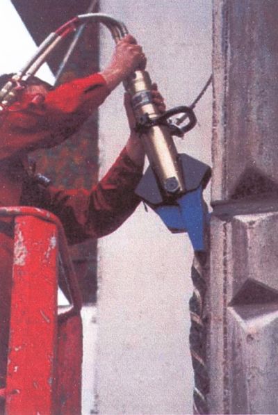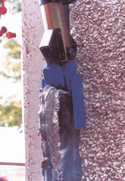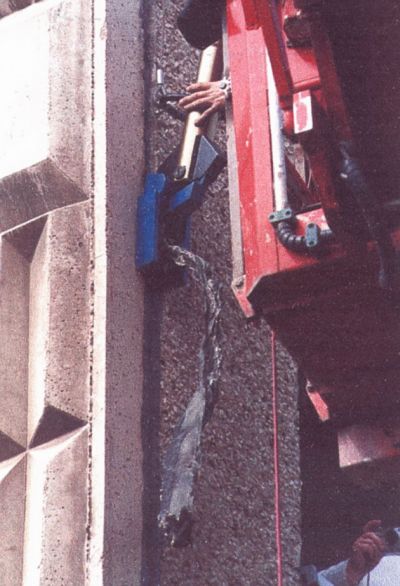 Ein Institut hat ein Verfahren für den Ausbau asbesthaltiger Fugendichtstoffe entwickelt. Mit einem hydraulischen Fugenausdrückgerät wird der Gefahrstoff aus den Fugen herausgedrückt. Der Antrieb des Druckwerkzeuges erfolgt hydraulisch. Ein sukzessiver Ausbau des Fugenkittes ist möglich. Da das Gerät an einer elektrischen Seilwinde hängt, ist für den Bediener ein ermüdungsfreies Arbeiten auch über einen längeren Zeitraum möglich. Der Bediener arbeitet von einer Hängebühne oder einem Gelenksteiger aus. Durch den Einsatz dieses Verfahrens ist das Einrüsten der Fassade nicht notwendig. Die körperliche Belastung wurde reduziert und es wurden keine freigesetzten Asbestfasern festgestellt.