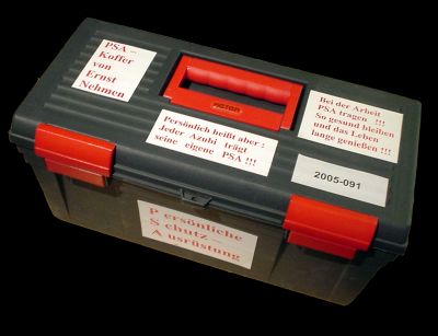 Die Schüler der Berufsbildenden Schule haben einen sog. PSA-Koffer erstellt. Dabei handelt es sich um einen handelsüblicher Kunststoff-Werkzeugkoffer, der mit PSA gefüllt ist: mit Schutzhelm, Handschuhen, Schutzbrille, Schutzmaske usw. Der PSA-Koffer stellt sicher, dass die Ausrüstung vor Beschädigungen und Verschmutzungen geschützt ist. Ziel ist es, das jeder Auszubildende seine Persönliche Schutzausrüstung vom ersten Ausbildungstag an zusammen mit seinem Werkzeugkoffer erhält und dafür auch verantwortlich ist. Zusätzlich wurde eine PSA-Gürteltasche entwickelt, sodass dadurch die PSA immer und überall griffbereit ist, auch wenn sie während der Arbeit nicht gebraucht wird. Durch einfache Mittel werden Mitarbeiter, in diesem Fall Auszubildende, dazu ermutigt, die PSA zu tragen und dafür zu sorgen, dass sie in einem ordnungsgemäßen Zustand ist. Es ist eine zusätzliche Motivationsmaßnahme, die für eine höhere Akzeptanz und Verfügbarkeit von PSA sorgt.