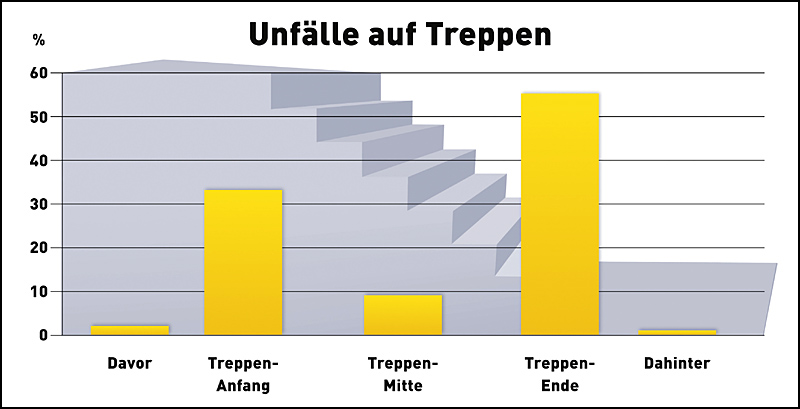 Im Jahr 2010 ereigneten sich rund 36.600 meldepflichtige Treppenstürze in Betrieben und Unternehmen. Etwa 90 Prozent dieser Unfälle geschehen auf der ersten und der letzten Stufe. Durch Markierungen kann die Sichtbarkeit dieser Bereiche maßgeblich erhöht werden. Die Safety Stripes GmbH, Seefeld, hat dazu ein flexibel einsetzbares Markierungsband entwickelt, das die Zahl der Treppenunfälle langfristig reduzieren kann.