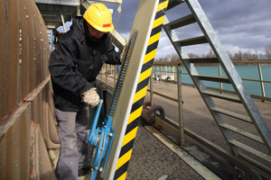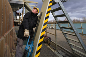 Im Unternehmen RMKS Rhein Main Kies und Splitt GmbH wurde von Heinz Schlecht eine fest installierte schwenkbare Treppen-Leiter mit integrierter Arbeitsbühne entwickelt, von der aus die Arbeiten am Greiferkopf jetzt sicher ausgeführt werden können. Die mit rutschsicher ausgeführten Treppenstufen und festen Handläufen versehene Leiter kann aufgrund eines optimierten Anstellwinkels auch mit Werkzeug sicher begangen werden.