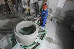 Die Herstellung von Betonringen für den Schacht- und Kanalbau erfordert häufig auch das werkseitige Anbringen von Bohrungen für entsprechende Anschlüsse. Bei der herkömmlichen Arbeitsweise wird die Bohrmaschine auf einem Gabelhubwagen montiert, mit Spanngurten am Betonring fixiert und für jede Bohrung einzeln ausgerichtet. In häufig stark gebückter Haltung und unter Kraftaufwand wird dann der Bohrvorgang durchgeführt. Bedingt durch den entstehenden Bohrschlamm besteht permanente Rutschgefahr und nach dem Trocknen eine erhöhte Staubbelastung in der Atemluft.