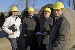 Das Projektteam Meyer Rohr+Schacht GmbH mit Dipl.-Ing. Karsten Volkmann, Dr. Uwe Wienhold, Edelgard Becker und Thomas Meyer (von links) vor den Polymerbetonröhren.