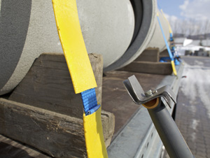 Für den Transport von Betonrohren werden hauptsächlich LKW eingesetzt. Für die zwingend notwendige Ladungssicherung werden Spanngurte verwendet, die in ausreichender Anzahl über die Betonrohre gelegt und fest mit der Ladefläche verbunden werden. Insbesondere beim Transport kommt es zwischen der rauen Oberfläche der Betonrohre und den Zurrgurten zu minimalen Relativbewegungen. Diese verursachen einen vorzeitigen Verschleiß der Gurte, der allerdings durch den Einsatz von Gurtschonern deutlich reduziert wird.
