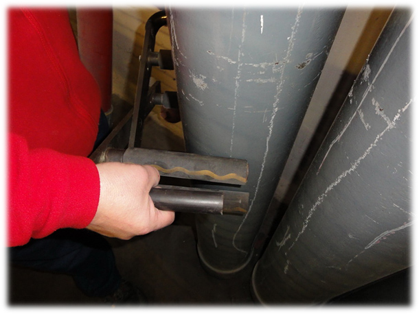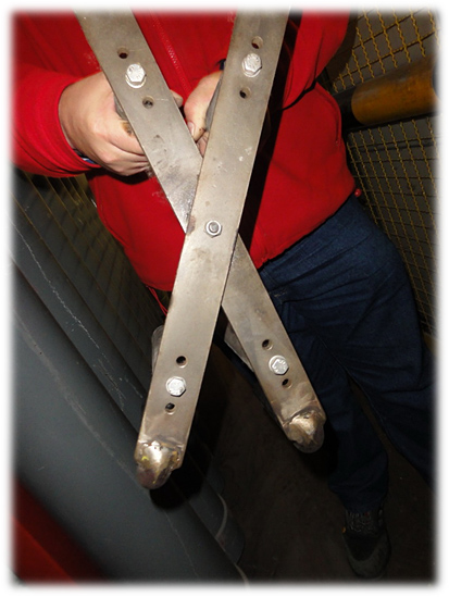 Die neue Vorrichtung erlaubt es, die Flasche von zwei Personen auch bei beengten Verhältnissen zu handhaben. Dabei handelt es sich um eine Hebehilfe, in die die Gasflasche eingeklemmt wird. Der „Flaschenheber“ wird zunächst um die Flasche gelegt. Durch das Anheben wird die Flasche eingeklemmt und kann sicher von zwei Personen in die vorgesehene Position gebracht werden. Diese Lösung ist preiswert und gleichzeitig einfach umsetzbar.