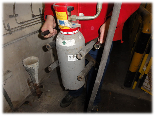 Beim Wechseln der Flaschen bedeutete bisher vor allem das Einhängen der gefüllten Flasche in die Wiegevorrichtung eine starke körperliche Belastung. Die Flasche wurde von einer Person dicht am Körper angehoben und musste in die Einhängevorrichtung bewegt werden. Auf Grund des hohen Flaschengewichtes klappte dies häufig nicht auf Anhieb, so dass die Flasche wieder abgestellt und erneut aufgenommen werden musste.