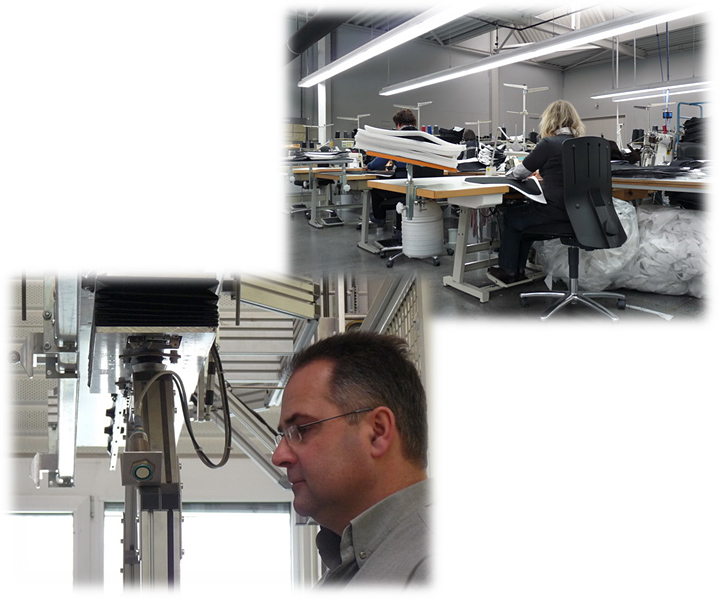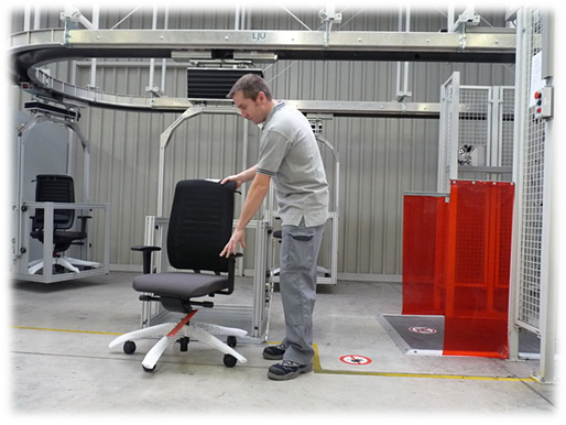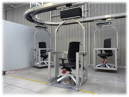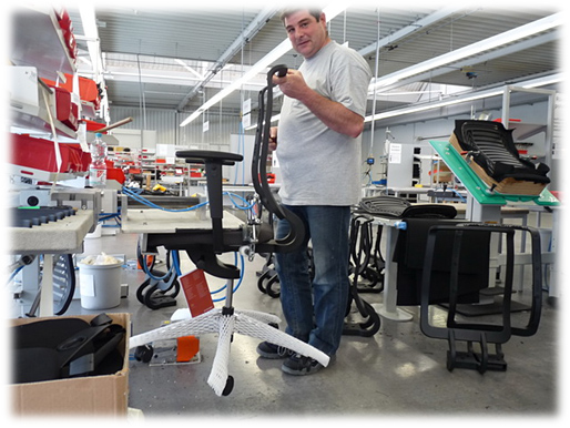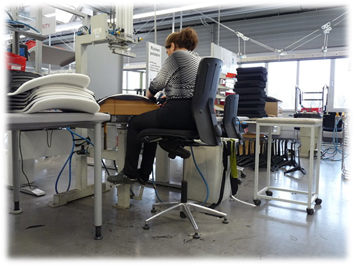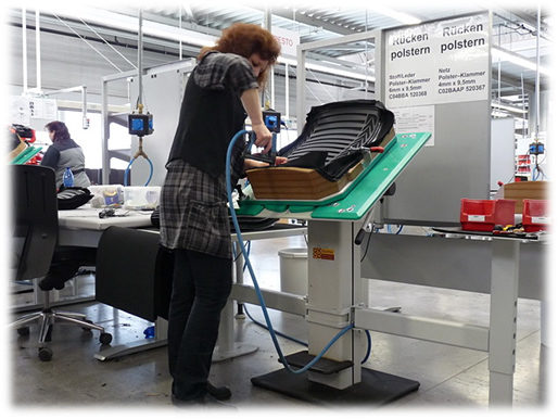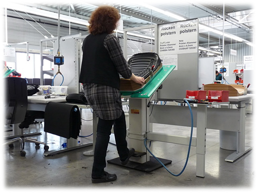 Für die Montage von Bürostühlen war es bislang erforderlich, die Stühle zum Bearbeiten mehrfach zu drehen, um sowohl die Ober- als auch die Unterseiten der Sitzflächen zu bearbeiten. Mit der neu entwickelten Vorrichtung lassen sich die täglich bis zu 70 Stühle mit einem Einzelgewicht von 20 bis 30 Kilogramm pneumatisch per Drehvorrichtung in die gewünschte Position drehen und am Ende des Arbeitsganges absenken.