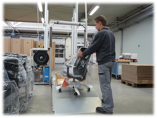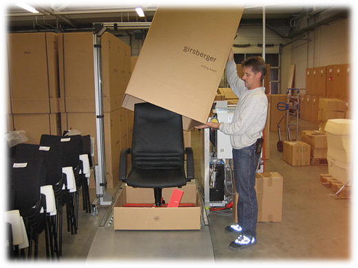 Im Versand wird der Stuhl auf einen vorgefertigten Kartonboden gestellt und ein Pappzylinder darübergestülpt. Danach wird der Karton in einer Umreifungsanlage behandelt und mit Hilfe einer Hebeanlage verschlossen, gestapelt und versandfertig gemacht. Das aufwändige Heben des Stuhls in einen Einzelkarton und das anschließende Stapeln entfallen.