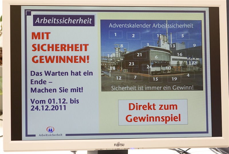 Der virtuelle Adventskalender ist über das Intranet aufrufbar. Ab dem 1. Dezember steht hinter jedem der 24 Türchen des Kalenders eine Frage zu Themen des Gesundheitsschutzes, der Arbeitssicherheit oder der Verkehrssicherheit. Häufig sind die Fragen so gestellt, dass eine richtige Antwort eine Recherche in den betrieblichen Informationsdatenbanken des Intranets erfordert. Auch Diskussionen, etwa in Arbeitsgruppen, können bei der Beantwortung helfen. Pro Frage gibt es drei Preise zu gewinnen. Die richtige Antwort sowie weitere Erläuterungen zum Thema und die Gewinner werden am folgenden Tag im Intranet bekannt gegeben.