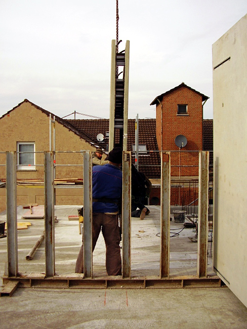 Die herkömmlichen bis zu zwölf Meter langen Gitterträger sind teilweise sehr schwer und lagern außerhalb der Produktionsräume. Sie werden per Winkelschleifer zugeschnitten und über einen Kran oder mit der Hand in die mit Bewehrungseisen vorbereitete Schalung eingelegt.