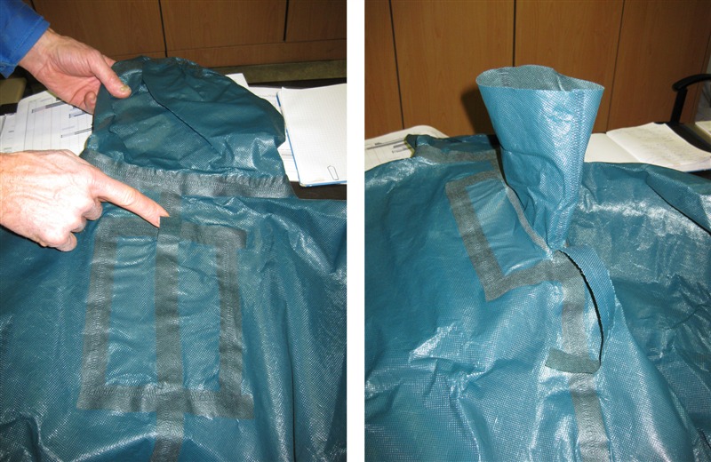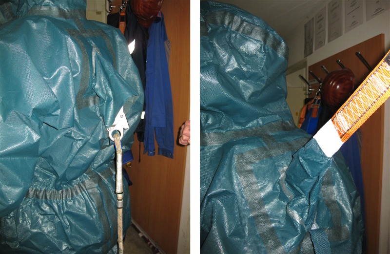 Ein neuer Einwegschutzanzug enthält eine integrierte Durchführöse für Absturzsicherungen. Der Gurt wird vor Verschmutzung geschützt. Somit ist ausgeschlossen, dass seine Materialeigenschaften durch Stoffkontakt beeinträchtigt werden. Der Schutz des Anzugträgers vor Kontamination bleibt vollständig erhalten, die Funktion der Absturzsicherung ist ebenfalls gewährleistet.