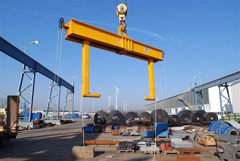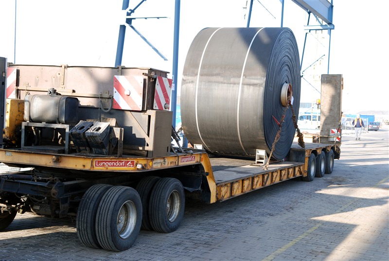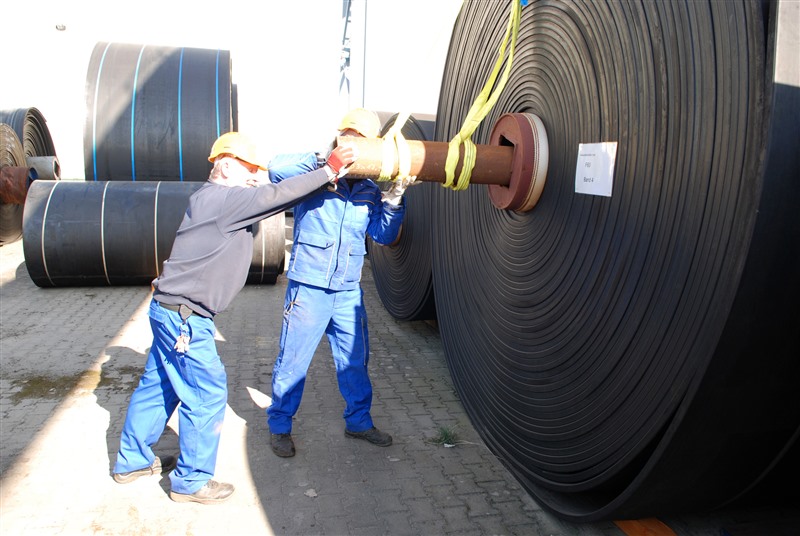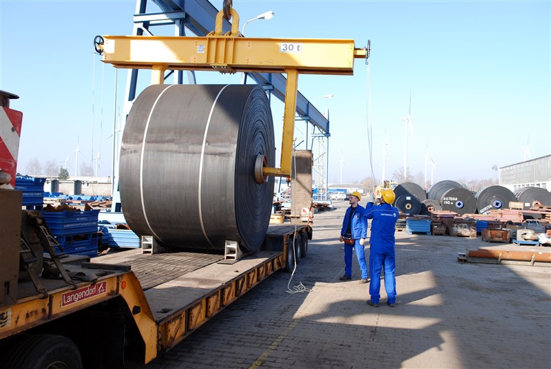 Die Fördergurte kommen als Gurtwickel auf das Betriebsgelände, wo sie bis zu ihrem Einsatz zwischengelagert werden. Das Aufnehmen der Gurtwickel erfolgt seit Kurzem mit einem neu entwickelten Lastaufnahmemittel. Dabei handelt es sich um eine Transport-Traverse mit manuell verstellbaren Greifern. Zwei jeweils an den Enden der Traverse angebrachte Kettenräder bewegen eine Spindel, mit der die Greifarme passgenau in den Wickelkern eingeführt werden können.
