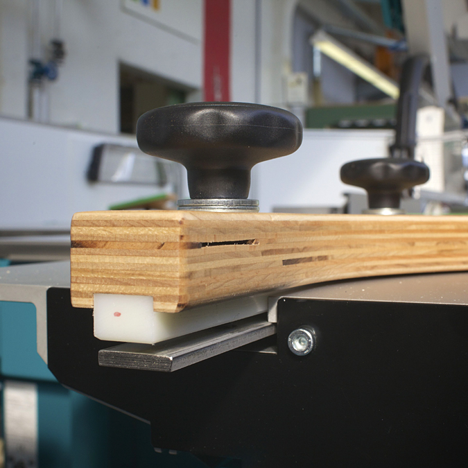 Ein Team von Mitarbeitern suchte nach Möglichkeiten zur Veränderung des Schutzsystems. Die bekannten Nachteile sollten beseitigt und der Aufwand bei der Verwendung des Schutzsystems auf ein Minimum reduziert werden. Ausgehend von dem existierenden System „Fritz + Franz“ wurde „Fritz“ so umgebaut, dass es nun möglich ist, diesen Teil der Schutzvorrichtung auf dem Maschinentisch ohne großen Aufwand sicher zu fixieren. Wesentlich dabei ist, dass damit auf einen zusätzlichen Anschlag oder Niederhalter verzichtet werden kann.