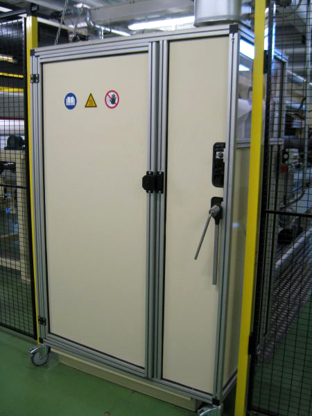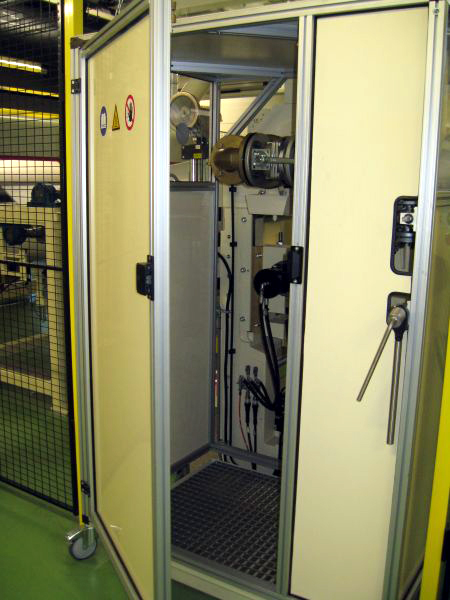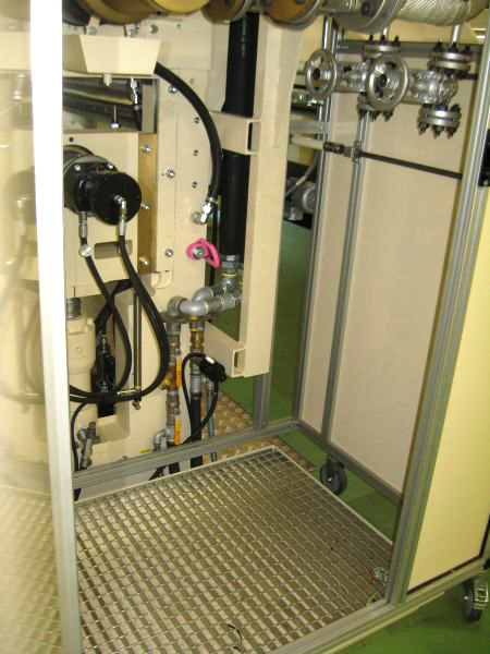Die Mitarbeiter können den Gefahrenbereich „Temperaturen bis 280 °C“ nicht erreichen. Der betreffende Anlagenteil kann über ein großzügiges Sichtfenster kontrolliert werden. Die Kabine ist mit vier Schrauben gegen Wegrollen gesichert. Für Reparaturen der Drehdurchführung ist der Zugang über eine Tür gewährleistet. Bei Walzenwechsel lässt sich das Dach mit wenigen Handgriffen abnehmen.
