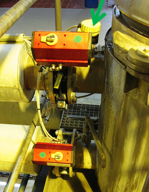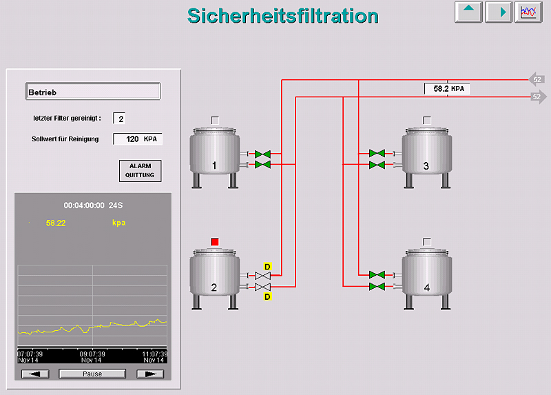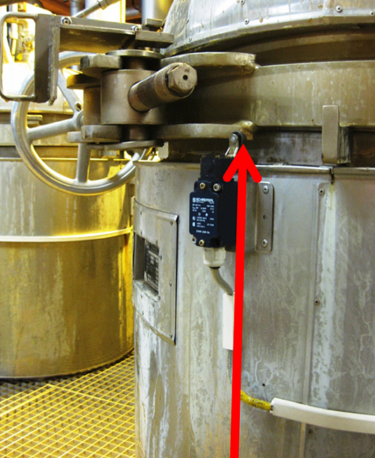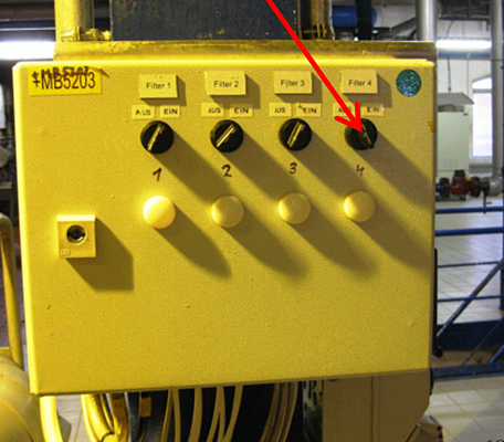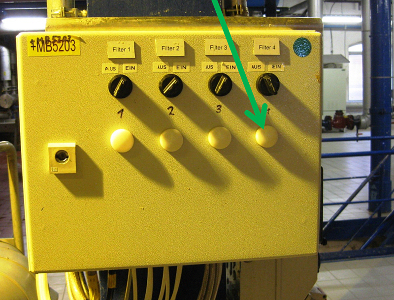 Durch Betätigung eines Knebelschalters vor Ort erteilt der Mitarbeiter nach Abschluss der Reinigung die Freigabe des Filters zur Produktion an das Prozessleitsystem. Durch Verwechslung der Filterbezeichnung konnte es zum Betätigen der Safteintrittsklappen bei geöffnetem Filterdeckel kommen. Dies wird durch einen beim Öffnen der Deckelklammer zwangsbetätigten und hart verdrahteten Schalter, der auf die Druckluftzufuhr der jeweiligen Klappen und das Prozessleitsystem wirkt, ausgeschlossen.