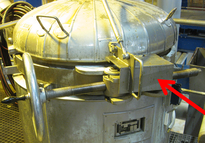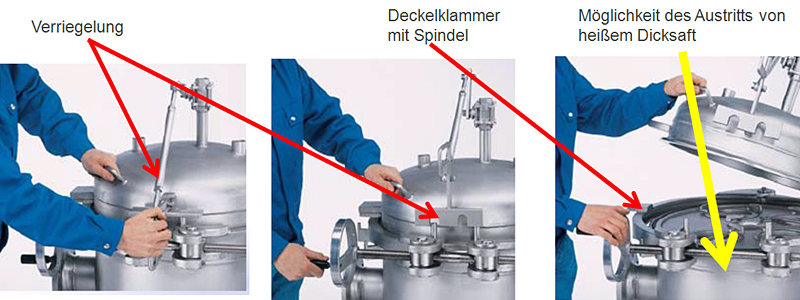 Herstellerseitig ist eine mechanische Zwangsverriegelung zwischen Entlastungsventil und der Spindel zum Öffnen der Deckelklammer eingebaut. Trotz dieser Verriegelung entwich beim Öffnen der Deckelklammer zu Wartungsarbeiten konstruktionsbedingt häufig heißer Dicksaft mit einem Druck von bis zu 4 bar. Um diese Gefahr zu beseitigen, wurden drei unabhängig voneinander wirkende Systeme am Filter nachgerüstet.