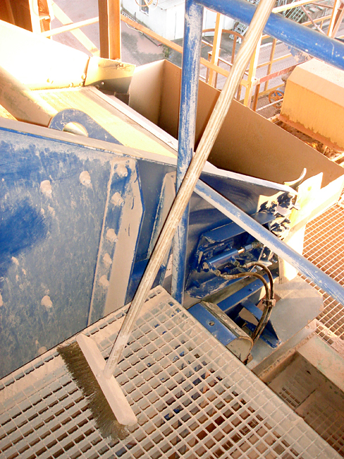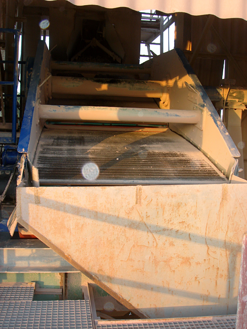 Die Siebanlage ist 5 Meter lang und 1,6 Meter breit und mit zwei, jeweils 2,5 Meter langen Längsmaschengeweben mit 0,5 mm Maschenweite und 40 mm Maschenlänge ausgerüstet. Der gesamte Massenstrom von 30 Tonnen pro Stunde wird direkt auf das Sieb aufgegeben. Sandkörner, die sich in den Maschen festsetzen, können den Siebdurchgang blockieren. Klemmkorn musste bisher alle 10 Minuten manuell mit einem Stahlbesen beseitigt werden. Diese Tätigkeit war körperlich sehr anstrengend und mit einer hohen Staubbelastung verbunden.