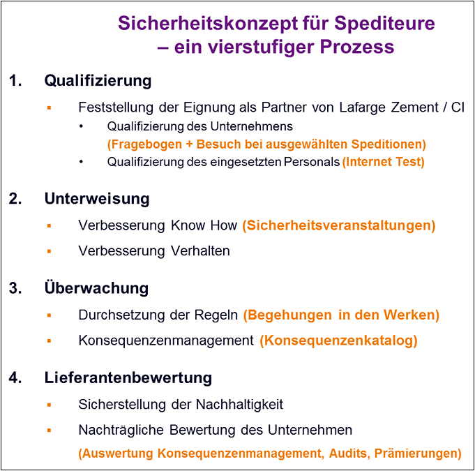 Die vier Stufen des Konzeptes sind Qualifizierung, Unterweisung, Überwachung und Lieferantenbewertung. In der Qualifizierunqsphase werden alle für das Unternehmen tätigen Speditionen und deren Subunternehmer anhand von Fragebögen qualifiziert. Ausgesuchte Speditionen werden besucht. Ziel ist es, eine Liste zugelassener Speditionen zu erhalten. Das Fahrpersonal wird über Online-Checks qualifiziert.