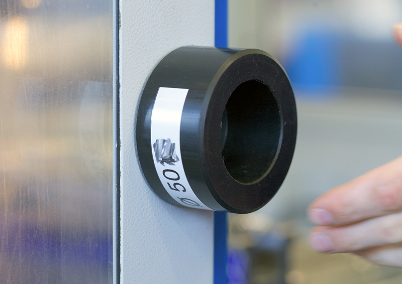 Wird ein mit einer Schutzkappe versehener Fräskopf in die Maschine eingesetzt, sorgt ein eingeklebter magnetischer Boden in der Kappe dafür, dass sie immer griffbereit verfügbar ist. Sie wird einfach an passender Stelle an die Fräsmaschine geheftet. Nach einem Fräskopfwechsel oder nach Beendigung der Arbeit kann die Kappe ohne Aufwand wieder auf den Fräskopf aufgesteckt werden. Eine Ablage für die Kappen sorgt für die sichere Lagerung und Entnahme der Fräsköpfe.