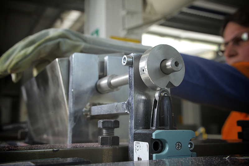 Gesucht wurde nach einem System, das diese Gefährdung beseitigt oder auf ein Minimum reduziert, gleichzeitig die Arbeit am Walzwerk aber nicht wesentlich beeinträchtigt. In vielen Entwicklungsschritten wurde eine Schutzvorrichtung konstruiert, die gewährleistet, dass der Maschinenbediener nicht an den Walzenspalt gelangen kann, solange die Maschine läuft. Dabei wurde besonderes Augenmerk darauf gelegt, dass die verschiedenen hier vorkommenden Anforderungen an die Maschine erfüllt werden. Auch wurde sichergestellt, dass die Reinigung der Maschine gefahrlos durchgeführt werden kann; die Sicherheitsvorrichtung kann zu diesem Zweck aufgeklappt werden. Dabei wird der Antrieb der Maschine automatisch ausgeschaltet.