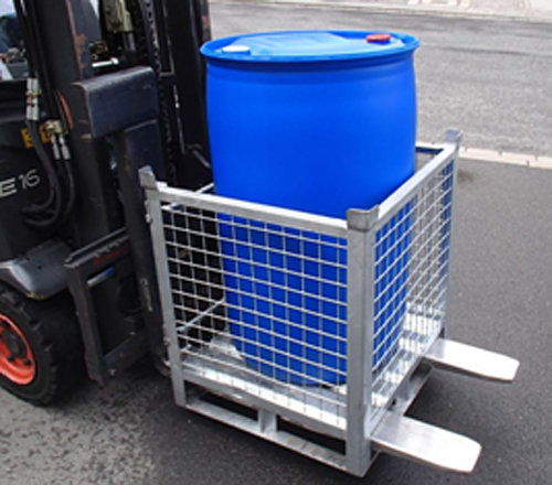 Jedes Fass wird fortan in eine einzelne Gitterbox gesetzt. Deren Abmessungen entsprechen dem größten Gebinde im Betrieb. Die Gitterbox ist aus Metall gefertigt, damit Restgebinde mit der Box in den Wärmeschrank gestellt werden können. Kufen an der Unterseite ermöglichen die Aufnahme von Gabeln eines Gabelstaplers, einer EGU oder eines Handhubwagens.