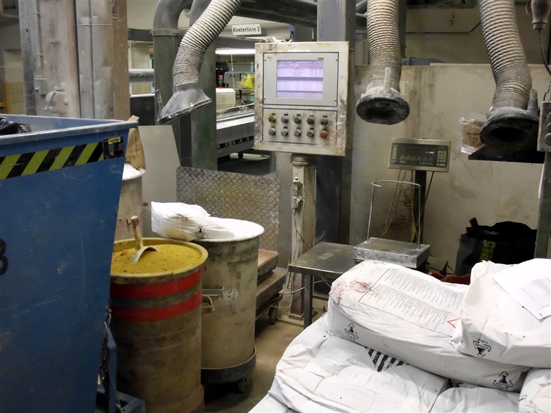 Das Abwiegen der Komponenten für die Mischung geschieht nun vollautomatisch, ohne dass ein Mitarbeiter beim Zusammenstellen oder beim Zugeben der Mischung die zum Teil pulverförmigen Materialien von Hand bewegen muss. Die Zugabe geschieht nun mit geschlossenen Kunststoffbeuteln. Dabei sind die Entstehung von Staub und die entsprechende Exposition für den Mitarbeiter auf ein Minimum beschränkt und die Belastung ist deutlich reduziert worden.