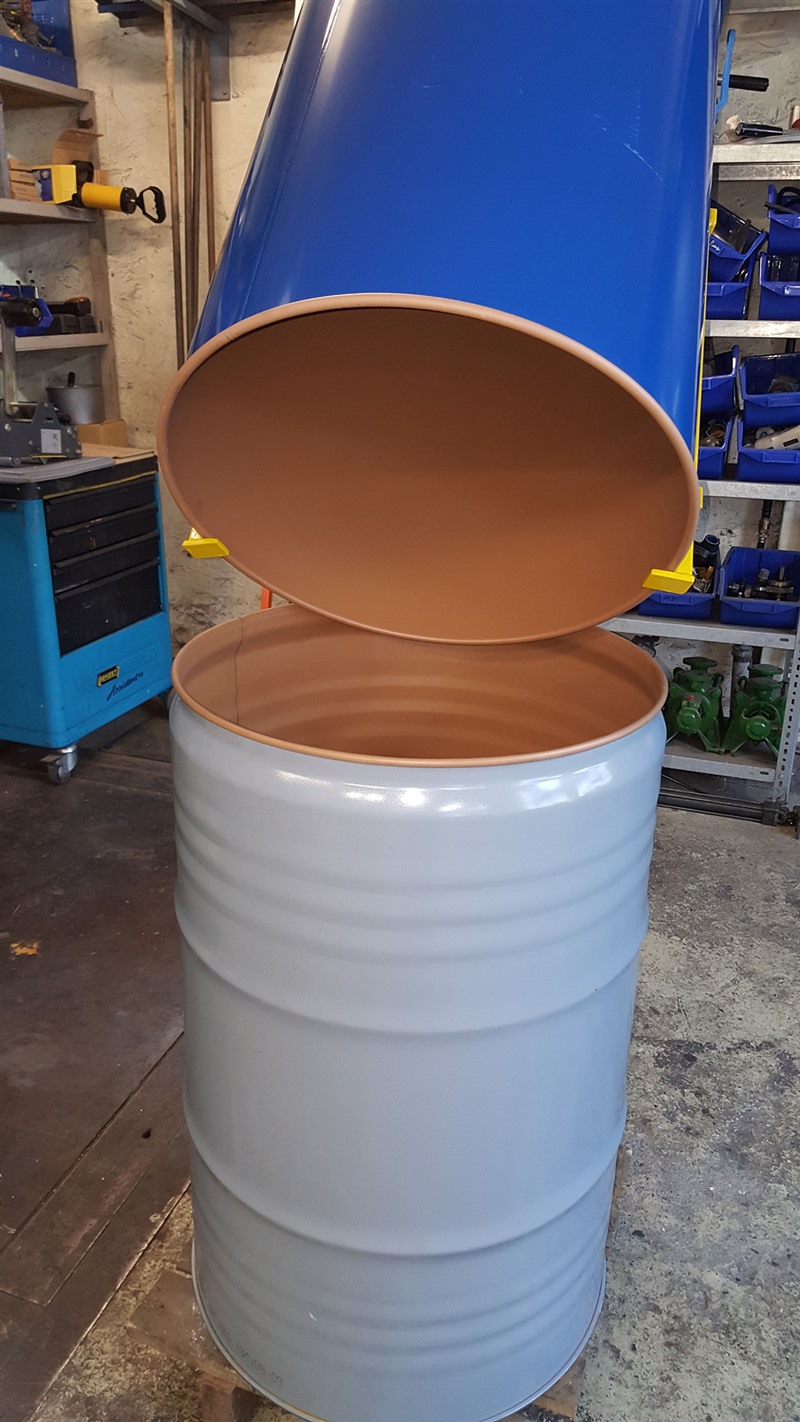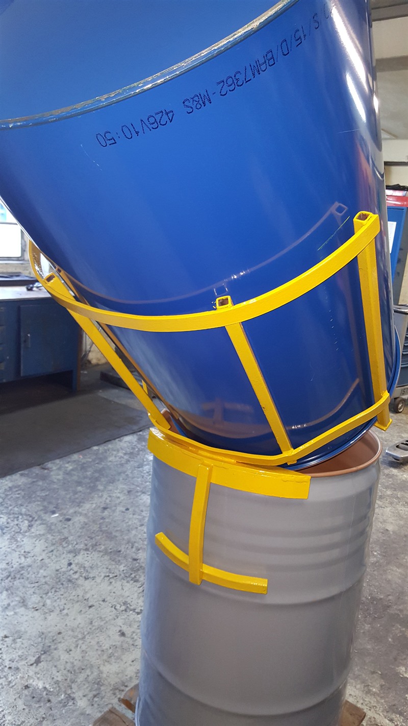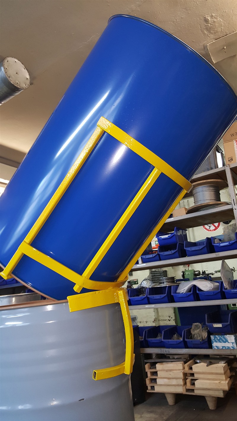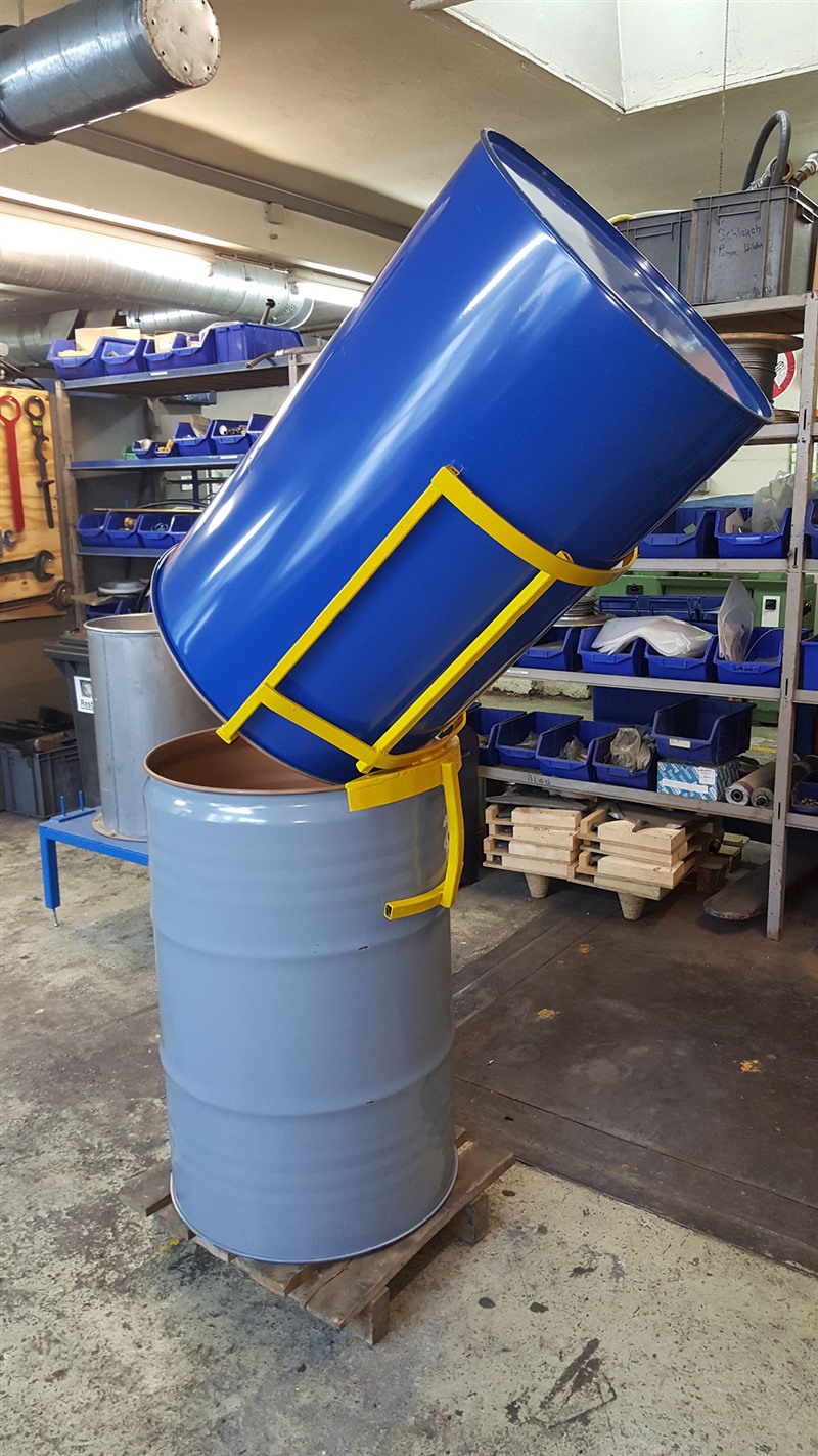 Das Unternehmen A. M. Ramp & Co. GmbH produziert ein komplettes Sortiment von Druckfarben für die Bereiche Tief- und Flexo-, Sieb-, Offset- und Tampondruck. Die teilweise sehr viskosen Rohstoffe werden in Fässern bis zu 200 Litern angeliefert und müssen in den Produktionsprozess eingefügt werden. Um eine möglichst vollständige Restentleerung zu erreichen, mussten die Fässer bisher von den Beschäftigten mitunter sehr lange in ergonomisch ungünstigen Schräglagen gehalten oder provisorisch fixiert werden. Eine unzureichende Sicherung konnte zu herabfallenden Fässern führen.
