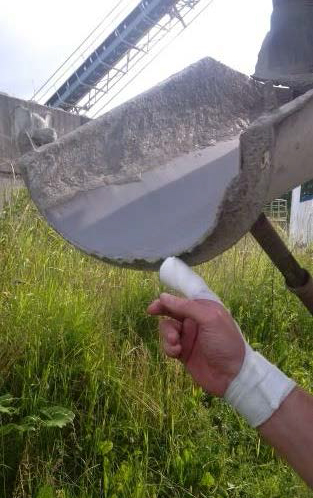 Fahrmischer können über eine fest am Fahrzeug montierte Rutsche den Beton aus der Mischtrommel auslaufen lassen. Je nach Gegebenheit vor Ort muss dieser Auslauf durch Verlängerungsrutschen erweitert werden. Diese Rutschen wiegen zwischen 10 und 21 kg und sind ca. 1 m lang. Beim Einhängen der Verlängerungsrutsche kann es immer wieder zu Quetschungen kommen, weil die Fahrer mit den Fingern einer Hand zwischen die beiden Rutschen geraten.