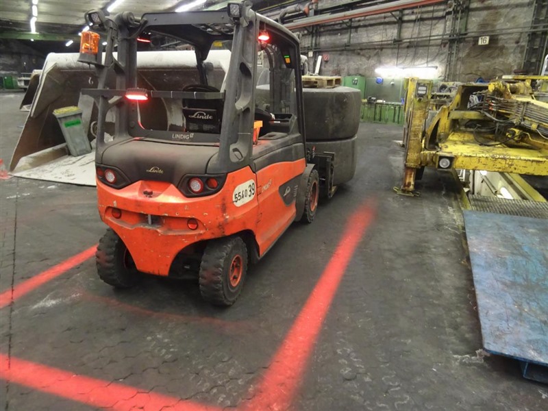 Mitarbeiter Martin Raabe schlug vor, an den Gabelstaplern zusätzliche Leuchten zu installieren, die den Gefahrenbereich um das Fahrzeug in einem hellen Rot kennzeichnen. Die so entstehenden Markierungen auf dem Boden sind auch bei voller Raumbeleuchtung gut zu erkennen.