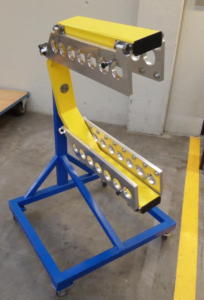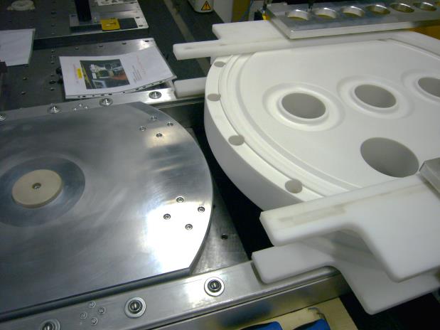 Aufgrund der eingeschränkten Platzverhältnisse in der Abteilung waren weder Kran noch Vakuumsauger einsetzbar. So wurde eine ergonomische Lösung in Form eines selbst konstruierten Schwenkwagens entworfen. Die Platte kann in die Aufnahme des Wagens gelegt und darin geschwenkt werden. Das Auffahren der Platte auf den Messtisch wird durch Kugelrollen unterstützt.