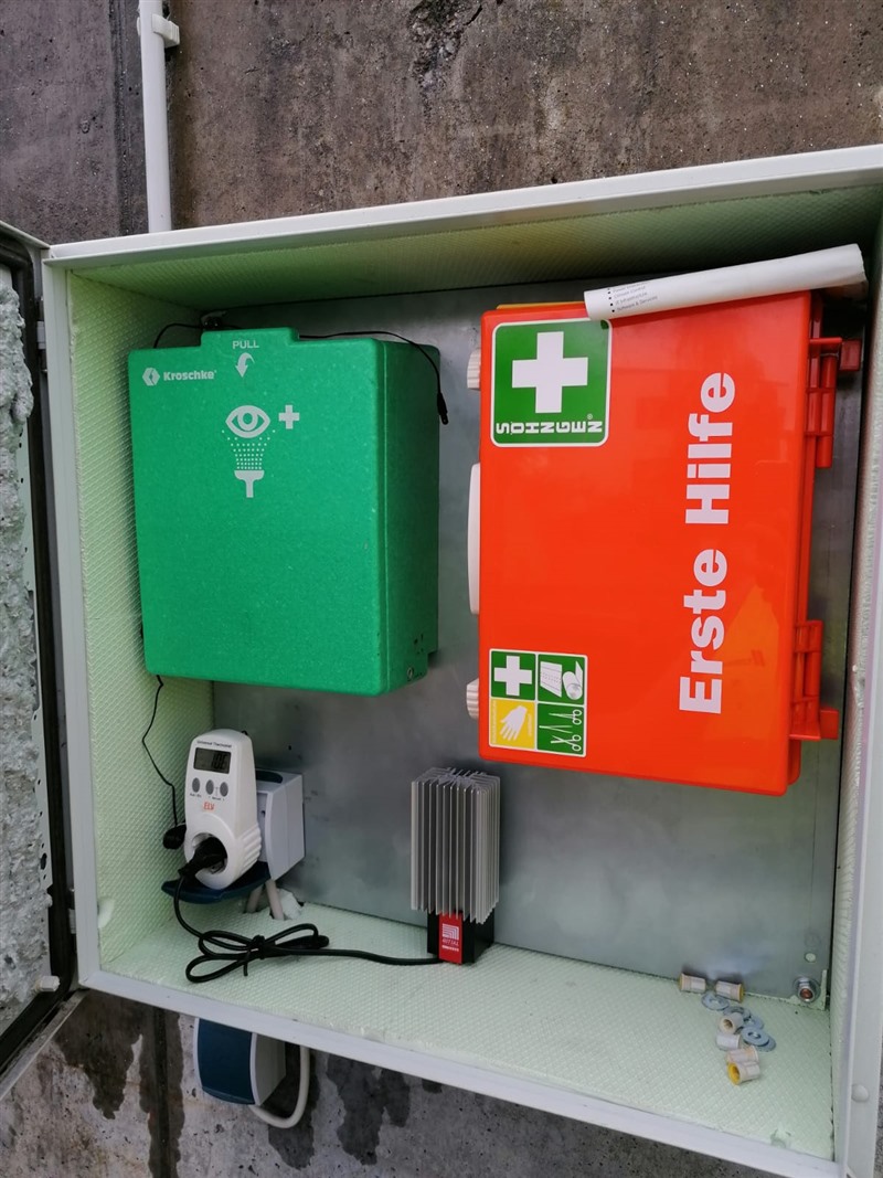Ziel war es deshalb, eine Lösung zu finden, die den Staub von den Augenspülflaschen vollständig fernhält und sie zudem vor Frost schützt. Dies soll den Mitarbeiterinnen und Mitarbeitern die Gewissheit geben, dass im Ernstfall und bei jeder Wetterlage jederzeit funktionierendes Erste-Hilfe-Material verfügbar ist.