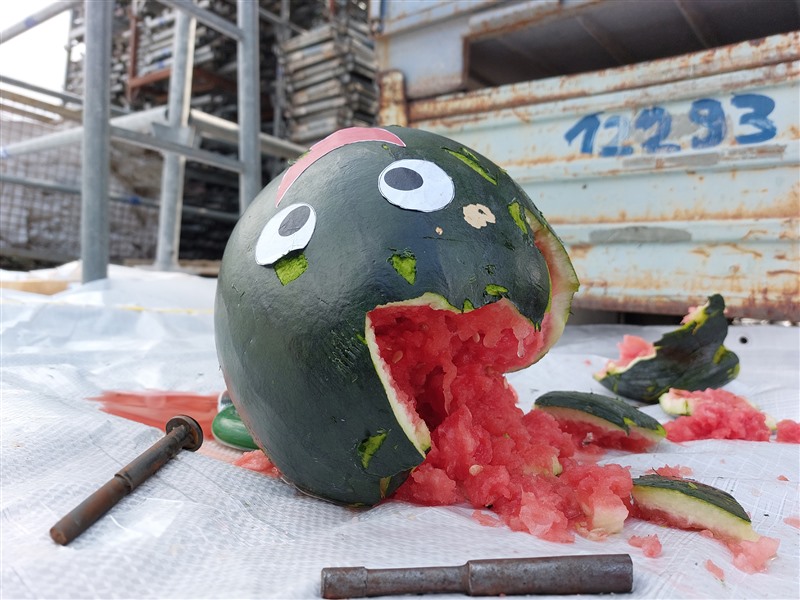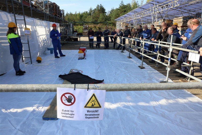 Von einem Gerüst aus sechs Meter Höhe wurden verschiedene Kleinteile auf eine am Boden liegende Melone fallengelassen. Zuerst trug die Melone dabei einen Arbeitsschutzhelm, im Anschluss blieb sie ungeschützt. Nach jedem Durchgang wurden mit den Teilnehmenden die Schäden an Helm und Melone und mögliche persönliche Auswirkungen besprochen.