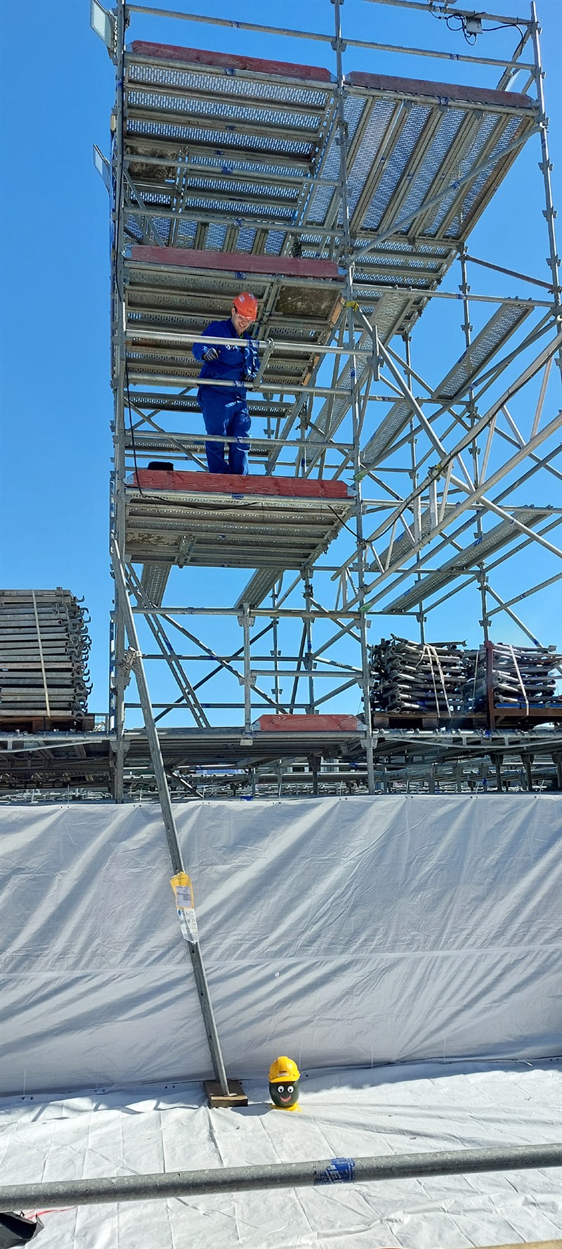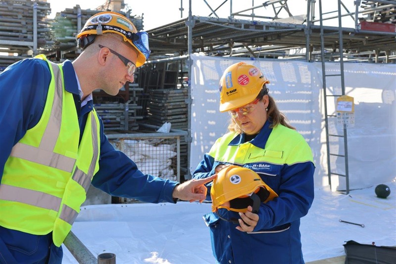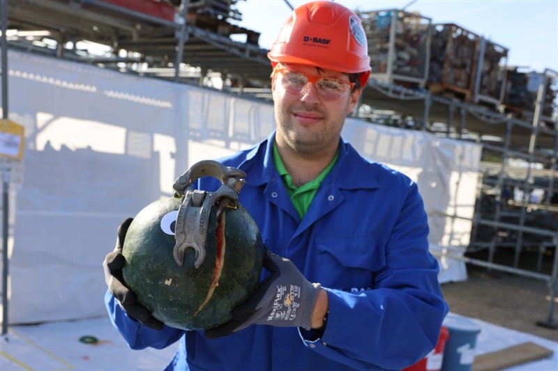 Um auf Gefahren durch herabfallende Gegenstände aufmerksam zu machen, haben Kolleginnen und Kollegen des Kontraktorenmanagements der BASF Schwarzheide GmbH gemeinsam mit Partnerfirmen aus den Gewerken der Verfahrenstechnik und des Gerüstbaus die Aktion „Michi-Melone“ initiiert. Die teilnehmenden Firmen waren angehalten, gewerketypische Gegenstände und Werkzeuge mitzubringen. Die Vielfalt reichte vom Hammer über Schraubenschlüssel bis zur Gerüstbaukupplung.