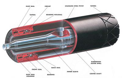 Das kommt daher, dass dem Gurtschieflauf mit extra Führungsrollen oder Führungsstiften begegnet wird. Damit die Standzeit der Gurte erhöht werden kann, ist ein Rollensystem notwendig, dass den Schieflauf des Gurtes möglichst verhindert. Ein Hersteller von Bandanlagen hat ein Rollensystem entwickelt, bei dem die Gurtkanten keinen Kontakt mit Führungsrollen oder deren Halterungen haben. Dieses Rollensystem ist speziell für die schweren Anforderungen der Steine und Erden sowie Bergbau-Industrie konzipiert worden. Auf rein mechanische Weise wird verhindert, dass der Gurt aus seiner Bahn herausläuft. Die Gurtrollen haben eine innenliegende zentrale Drehachse, die lotrechte zur Oberfläche des Gurtes liegt. Wenn der Gurt aus der Spur läuft, werden die spitz zulaufenden Enden der Rolle durch den Gurt berührt.Dadurch wird die Gurtrolle gezwungen, sich um die zentrale lotrechte Drehachse zu drehen, womit der Gurt in seine ursprüngliche Position zurückgeschoben wird. Der Grad der Drehung der Gurtbandrolle hängt davon ab, in wieweit der Gurt sich aus seiner ursprünglichen Position heraus bewegt hat. Wenn die Gurtbandrolle den Gurt zurück in das Zentrum gelenkt hat, wird der Gurt die gegenüberliegende Seite der spitz zulaufenden Rolle berühren jetzt stellt sich die Rolle wieder selbständig senkrecht zur Gurtbandrichtung. Da die Gurtbandoberfläche über die gesamte Breite 4 in Kontakt mit der Führungsrolle bleibt, ist die Führungsmöglichkeit erheblich effektiver und direkter als bei den Rollen, die keinen vollständigen Kontakt mit der Unterseite des Gurtes haben, um ihn zu führen. Dieses Rollensystem schont die Gurtkanten über den gesamten Bereich, da keine seitlichen Führungsrollen mehr notwendig sind.