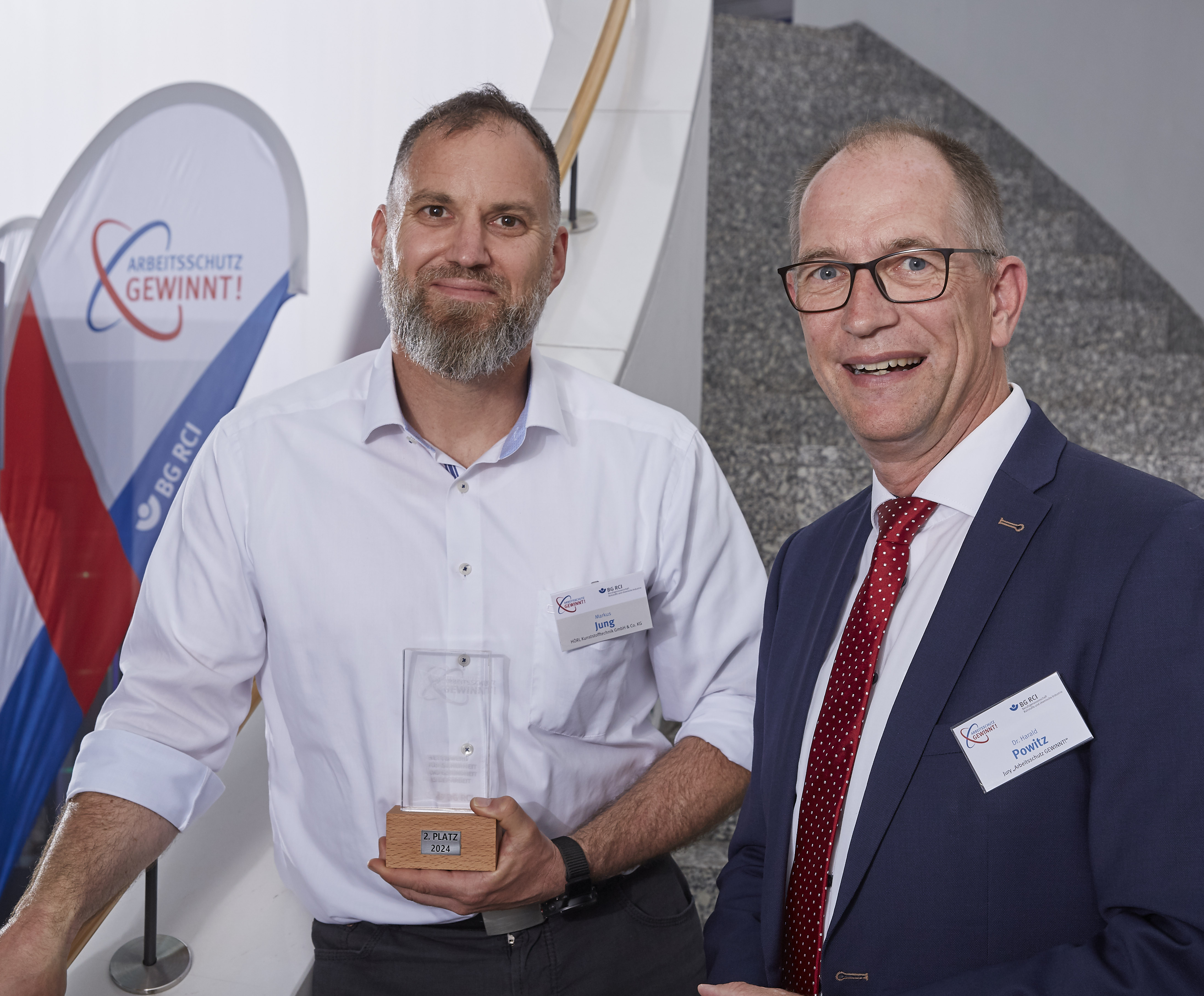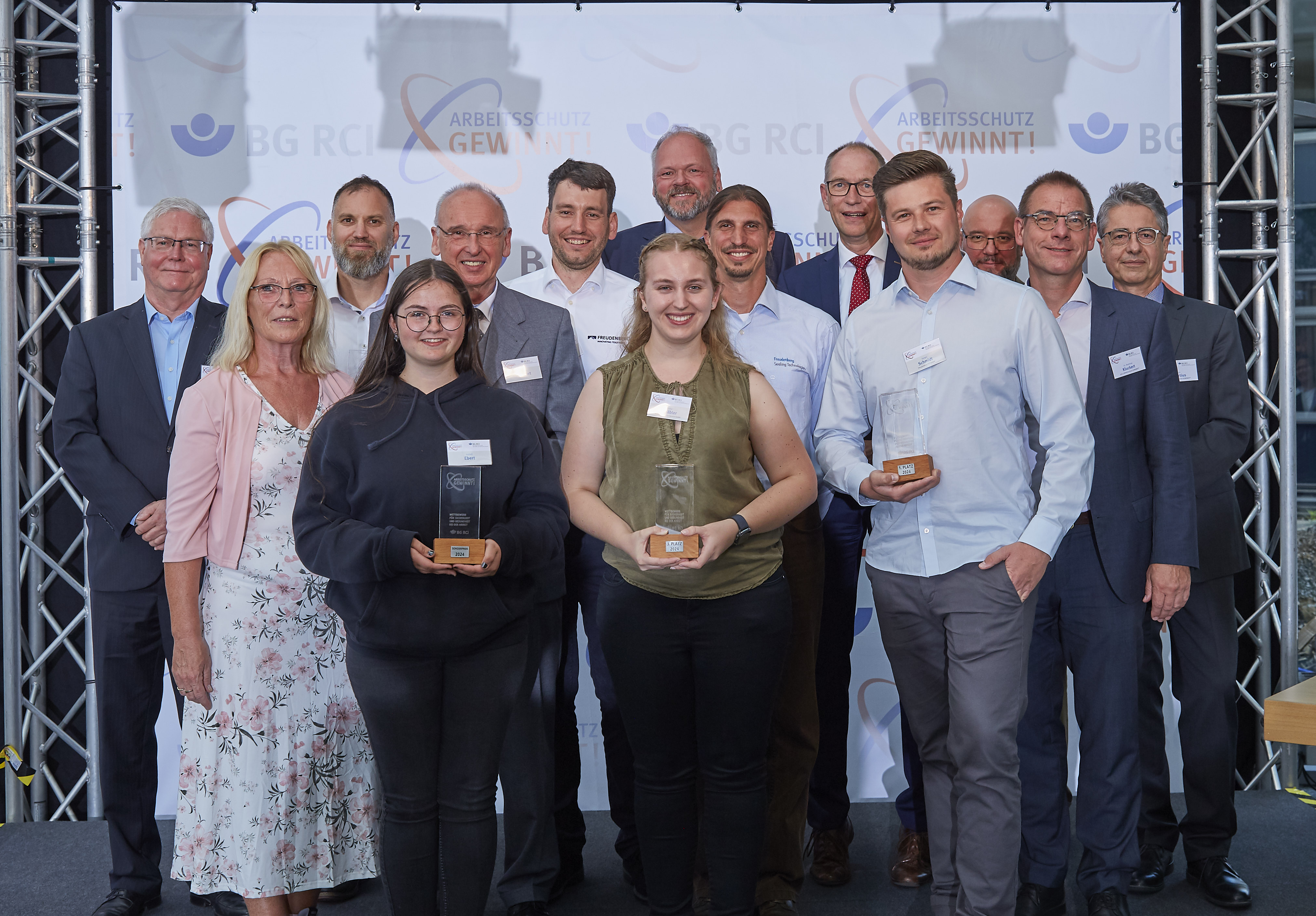 Dr. Volker Wittneben, Leiter Aufsicht und Beratung BG RCI, Gabriele Schaale, Mitglied des Vorstands der BG RCI, Markus Jung, HÖRL Kunststofftechnik, Isabell Ebert (Sonderpreis), Prof. Dr. Bernd Schubert, alternierender Vorsitzender des Präventionsausschusses der Vertreterversammlung der BG RCI, Felix Halter, Freudenberg FST GmbH, Annika Schäbler, Procter&Gamble Service GmbH, Thomas Leitmann, Mitglied der Vertreterversammlung der BG RCI und Vorsitzender im Präventionsausschuss der Vertreterversammlung, Uwe Franzmathes, Freudenberg FST GmbH, Dr.-Ing. Harald Powitz, Mitglied der Vertreterversammlung der BG RCI und Vorsitzender des Beirats Zucker, Sergej Schmidt, Freudenberg FST GmbH, Vladim Lienuk, stv. Vorsitzender im Präventionsausschuss des Vorstands, Dr. Matthias Kluckert, stv. Leiter der Prävention der BG RCI, Jan Martius, Leiter des Präventionszentrums Hamburg-Langenhagen